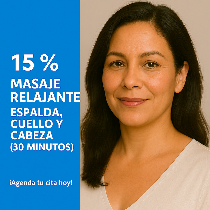 ¿Sientes tensión muscular, rigidez o estrés acumulado? Nuestro Masaje Relajante de Espalda, Cuello y Cabeza es ideal para aliviar contracturas, relajar la mente y liberar la tensión que se acumula en el cuerpo debido al ritmo diario. Disfruta de 30 minutos de bienestar profundo y aprovecha nuestro 15% de descuento por tiempo limitado.